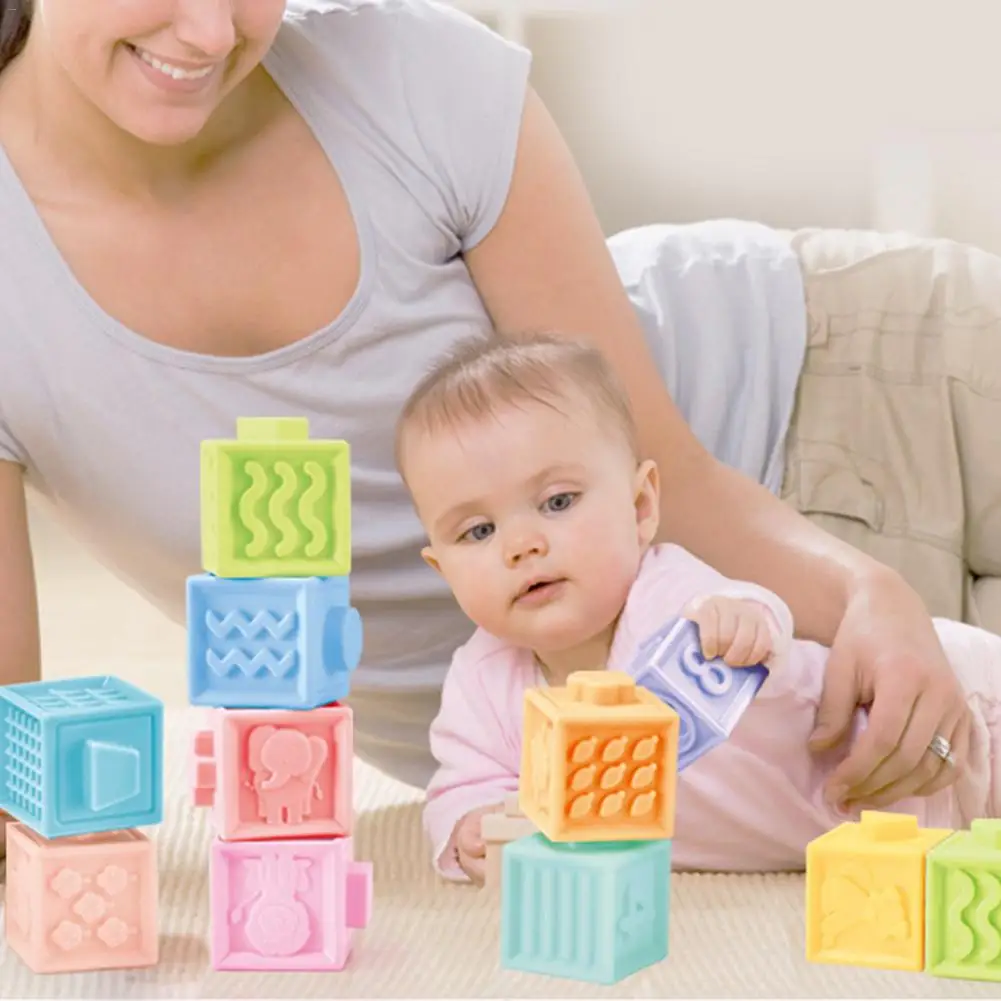 3D Embossed Educational Soft Rubber Building Blocks Food Grade Baby bebe Teether Bath Cognitive Ear